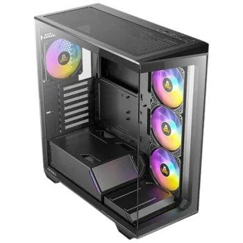 The front and left panel employ a unique 45° beveling technique that breaks the barrier between the two pieces of glass. The extremely fine edge of the glass joint enhances the uninterrupted, panoramic, and ultra-transparent visual experience of the 270° view, allowing comprehensive showcase of high-end PC components and dazzling lighting effects.
